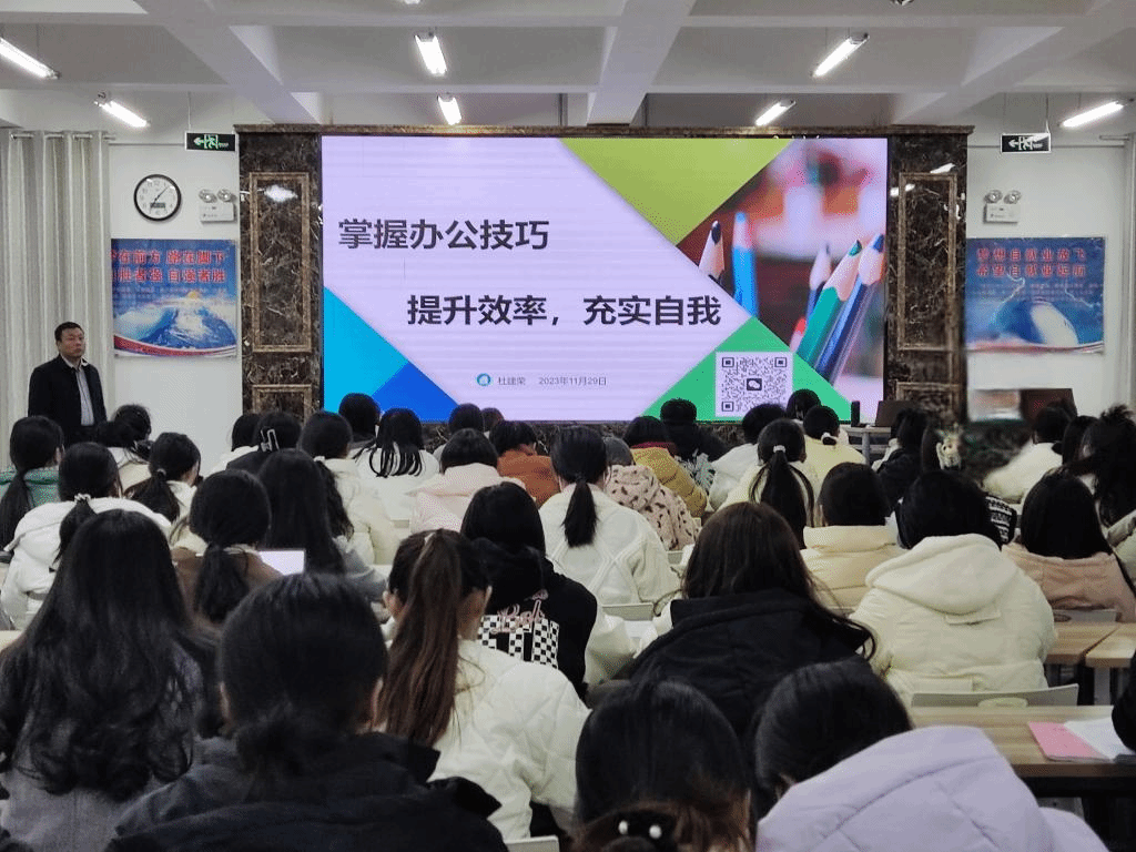 11月29日晚,bevictor伟德官网邀请信息技术与传媒公司杜建荣副教授为团学组织工作人员培训班作办公自动化专题培训,培训在员工发展中心就业大厅举办,bevictor伟德官网团委、员工会组织和各班级班委、团支部委员会成员共计300余人参加培训。